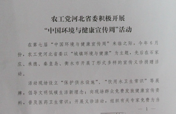 “中国环境与健康周”是农工党中央联合教育部、环境保护部等部门,为配合国际社会要求和《国家环境与健康行动计划(2007-2015)》,广泛宣传以人为本、人与自然和谐相处的理念,进一步增强全民环保意识,减少环境污染及其对健康危害的风险,提高人民群众的健康水平和全社会的可持续发展能力而发起举办的一项主题活动。从2008年第一届活动开展以来,农工党河北省委会已经连续七年开展此项活动。