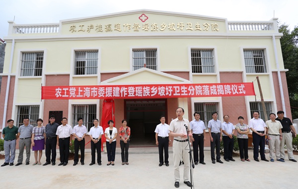 在落成仪式上,农工党中央副主席、上海市委会主委蔡威,农工党广西区委会主委彭钊,中共广西区委统战部副部长李东兴和中共百色市委常委、统战部部长黄彩毕共同为坡圩卫生分院揭牌。农工党上海市委会秘书长王晓东代表市委会接受了田东县政府赠送的题为“扶贫济困 情系瑶乡”的牌匾。田东县政府向陈伟峰董事长颁发了捐资荣誉证书。