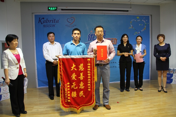 本次活动共向济南市按摩医院捐赠了价值10万元的佳贝爱特羊奶粉。段青英亲手向济南市按摩医院的脑瘫患儿赠送了奶粉。济南市残联书记、理事长孙君涛向捐赠方佳贝艾特羊奶粉授予了感谢锦旗。