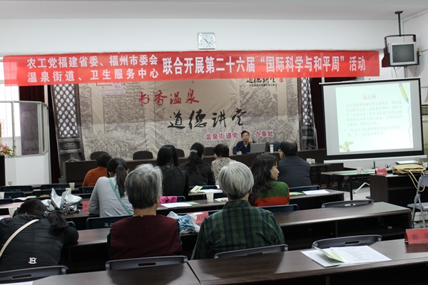 2014年11月12日,农工党福建省委会和农工党福州市委会在温泉街道会议室联合举办第二十六届“中国国际科学和平周”活动。活动邀请福州市红十字会江鲁萍主任为温泉街道的居民做了“急救知识”的讲授;福建中医药大学博士生导师、国医堂主任医师黄海教授做了“认识冠心病与心绞病”的科普知识讲座。