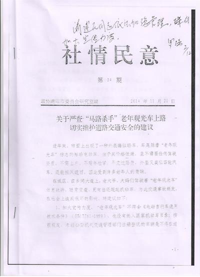 谢林川认为,老年观光车存在极大安全隐患、无上路资格,且驾驶危险,造成交通事故频发,影响恶劣。他建议加大宣传力度,从源头严格治理并加大执法力度严肃处理。罗强书记高度重视,批示:“请建民同志依法加强管理,媒体加大宣传力度”。