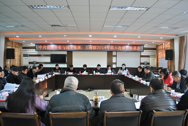 20141219日上午,中共宜宾市委与民主党派、工商联2014年第六次“双月座谈会”召开。会议通报了宜宾市2014年党风廉政建设和反腐败工作情况,并听取了各民主党派、工商联负责人、无党派代表人士的意见和建议。农工党宜宾市委会副主委何山、魏琴,市委会秘书长刘敏参加会议。
