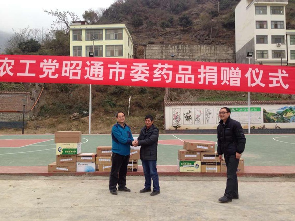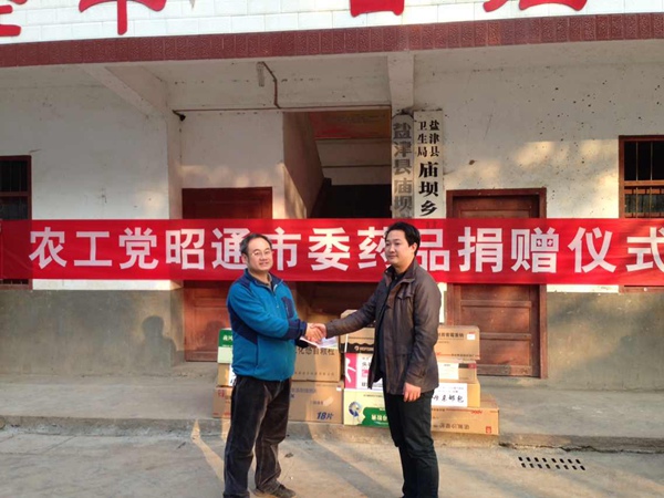 2014年12月30,农工党昭通市委会饶忠明专职副主委亲自带队向农工党的社会服务基地大关乡寿山卫生院、甘海村卫生室、盐津庙坝卫生院送去了价值10万余元的药品,同时也提前给当地的百姓送去了新春的祝福。(梁开荣)
