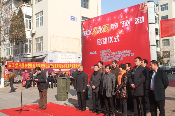 2015年2月10日上午,由农工党日照市委会、日照市侨联、致公党日照总支等单位主办的2015春节“五送”活动在东港区日照街道昭阳社区拉开帷幕。日照市政协副主席、农工党日照市委会主委林玉营,市侨联主席、致公党日照总支副主委张宗焕出席活动,市侨联副主席李儒君主持了仪式。