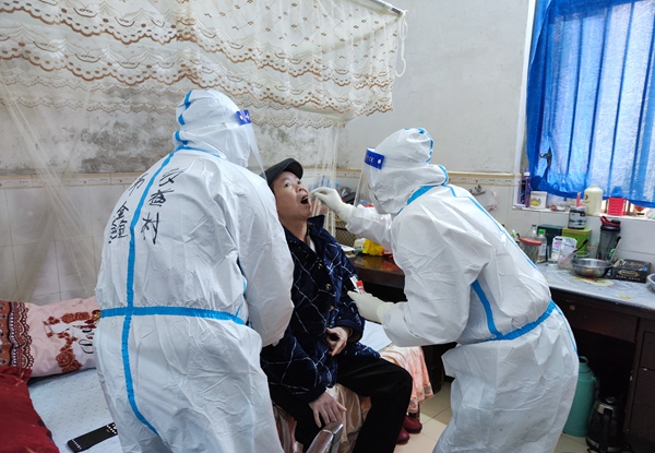 农工党百色市科技管理支部副主委、德保县都安乡多益村工作队员韦鑫上门为高龄伤残脱贫户采集核酸