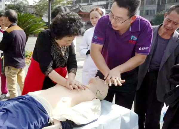 20151010日,是第六个“急救白金十分钟——全国自救互救日”。成都市第三人民医院在都江堰景区举行了以主题是“掌握心肺复苏技术”急救科普知识活动。活动中,该院派出急诊科副主任、农工党成都市三医院支部主委项涛作为急诊医疗专家针对游客高发的猝死、扭伤、跌倒等意外情况在现场演示了急救技巧,数百名游客现场观摩。(农工党成都市委会
