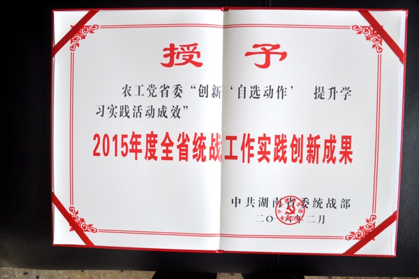 近日,中共湖南省委统战部下发文件,对全省统一战线各部门2015年实践创新成果进行通报表彰,农工党湖南省委会报送的开展坚持和发展中国特色社会主义学习活动经验成果《创新“自选动作” 提升学习实践活动成效》获得中共湖南省委统战部肯定,喜获“2015年度全省统战工作实践创新成果”奖。