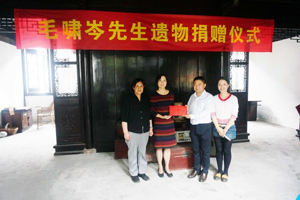 201663日上午,毛啸岑的孙女、65岁的毛一平专程从上海来到黎里,将爷爷毛啸岑使用过的桌椅、文件柜、沙发、床等家具及皮箱、保险箱等遗物,捐赠给黎里镇文保所,用于农工党江苏地方组织早期革命活动旧址的布展工作。