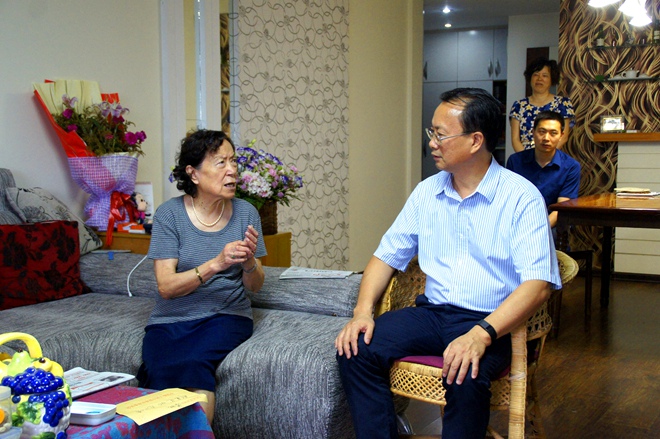 2016年6月14日,阳光灿烂,万绿婆娑。重庆市人大常委会副主任、农工党重庆市委会主委杜黎明前往重庆医科大学附属儿童医院住宅区,向即将迎来九十岁生日的市委会原副主委郑惠莲祝寿。