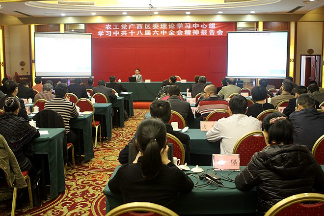 廖胜平博士从把握中共十八届六中全会的重大意义,结合中国共产党党内政治生活的准则、党内监督条例对六中全会精神进行深入解析,对关于领导核心问题展开详细分析论述。整场专题辅导报告脉络清晰、生动形象,内容深入浅出,通俗易懂,既有理论性,又有现实性,有高度、有深度、有广度,进一步加深了大家对中共十八届六中全会重大意义的认识,进一步增强学习贯彻全会精神的自觉性和坚定性。大家表示要更加自觉地在思想上政治上行动上同以习近平同志为核心的中共中央保持高度一致,不忘合作初心,继续携手前进,切实承担起中国特色社会主义事业的亲历者、实践者、维护者、捍卫者的政治责任。(陈丽好)