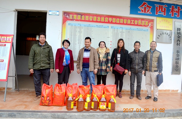 2017120日,农工党钦州市委会联合市司法局、中国电信钦州分公司一起深入精准扶贫联系点——钦州市灵山县三隆镇金西村开展慰问活动。在听取了驻村第一书记2016年“精准扶贫”工作总结和2017年工作思路后,农工党钦州市委会主委梁菊表示,市委会在2017年将继续深入开展精准扶贫工作,充分发挥智力密集、联系广泛的特点和优势,助推贫困户脱贫。随后,市委会为村委送上帮扶资金,慰问了村干部和驻村第一书记、工作队员,实地走访到扶贫户家中,送去油、米等生活必需品,送去新春的问候和美好的祝福。(宁丹)