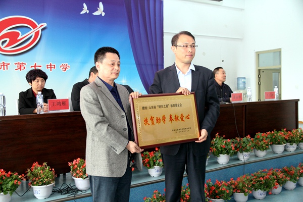 肇东市教育体育局向明日之星教育基金会颁发“扶贫助学爱心奉献”纪念牌。