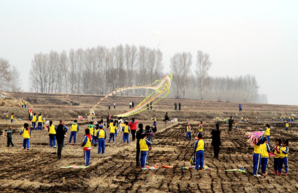 刘长青、韩占路为风筝龙头点睛。在老师们的精心组织下,双丰中心小学校300名学生进行了风筝放飞表演。