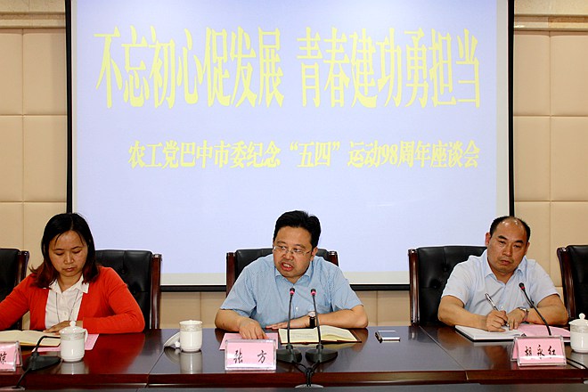 2017年5月2日,农工党巴中市委会召开以“不忘初心促发展,青春建功勇担当”为主题的纪念“五四”运动98周年座谈会。市政协副主席、农工党巴中市委主委张方出席,会议由副主委、秘书长胡永红主持。本次活动是为了进一步弘扬“爱国、进步、民主、科学”的五四精神,激励引导全市青年党员坚定理想信念,展示青春风采。