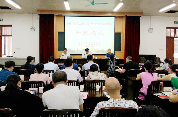 2017年7月3日至7日,农工党广西区委会在广西大学举办2017年全区骨干党员培训班。区委会专职副主委何玉庭,广西大学继续教育学院副院长卢绍等领导出席开班仪式。区委会秘书长、组织部部长庞文斌主持开班仪式并作培训班总结讲话。