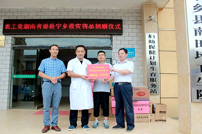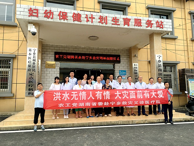 农工党湖南省委会坚决贯彻落实中共湖南省委的决策部署和杜家毫书记7月2日讲话精神,积极履行“关于全省民主党派组织和民主党派成员支持和投身抗洪救灾的倡议”,灾情发生后,涌现出一批优秀党员,自发通过各种途径、多样形式积极投入到了抗洪救灾之中,对灾区进行生活物资和药品方面的援助。7月9日,省委会组织由湘雅医院、湘雅附三、省人民医院、省胸科医院、长沙市一医院、长沙市四医院等支部医务工作者组成专家医疗队赴宁乡坝塘镇南田坪村开展救灾义诊,现场接诊群众190人次,发放洪涝灾害预防宣传资料500余份,结合灾区急需,以皮肤病和肠道传染病为重点,给村民进行卫生防疫知识讲解,指导村民进行环境消毒处置,现场有近300群众接受咨询。义诊结束后,专家们还到南田坪卫生院查房巡诊,为13位病人给出了治疗方案建议。在南田坪卫生院,农工党湖南省委还向南田坪卫生院、龙福新村卫生室捐赠了分别由泰阳医药发展有限公司(10.8765万元)、长沙三真医院(0.6万元)提供的共计11.4765万元的常用急需药品和卫生防疫消毒用品。