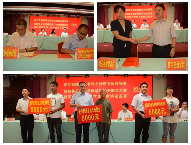 根据农工党河南省委会及郑州安图生物、黄河交通学院与中共南召县委、县人民政府分别签署的协议,安图前进老战士抚慰金将对包括2名抗战八路军老战士在内,列入南召县民政局贫困优抚对象的92名参加过抗日战争、解放战争、抗美援朝等战争的老战士,2017年至2020年间每人每年给与5000元的抚慰金,帮助这些老战士改善生活、安享晚年。黄河前进贫困大学生资助金将在2017至2021年间每年资助从南召县招录的10名优秀贫困大学生免除本科四年、大专三年的全部学费等,其中本科生每人每年免除学费14900元,大专生每人每年9900元。河南省慈善总会慈善助学行动,将对100名南召县今年被二本以上高校录取的贫困大学生每人资助善款5000元。