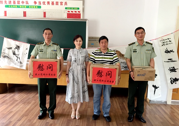 省委会秘书长戚青青和农工党党员、浙江联谊文化发展有限公司董事长詹其顺代表省委会向武警中队捐赠了药品,感谢武警官兵们一直以来不畏严寒酷暑,坚守岗位,有力的保障了省行政中心的安全运作。
