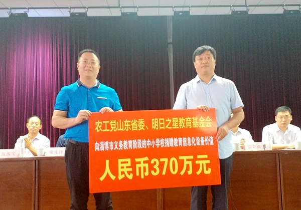 此次捐赠活动由农工党山东省委会、明日之星教育基金会分别向淄博市教育局、临淄区教育局捐赠价值370万元、75万元的教辅物资。农工党淄博市委会主委张京河现场向明日之星教育基金会会长张明勇同志颁发荣誉证书。