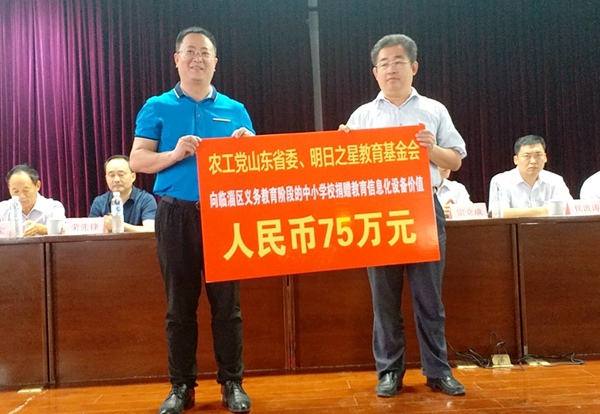捐赠活动由临淄区区委统战部副部长王晓滨主持,临淄区人大常委会副主任武守男,山东省工商联副主席、明日之星教育基金会名誉会长宗立成分别致辞,农工党山东省委会专职副主委王军作了重要讲话。