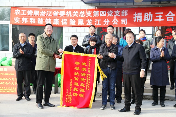2017年10月9日下午,农工党黑龙江省委会机关总支第四支部、安邦保险集团和谐健康保险有限公司黑龙江分公司向林甸县鹤鸣湖镇三合村贫困人口捐助和谐健康保险仪式在三合村委会举行。