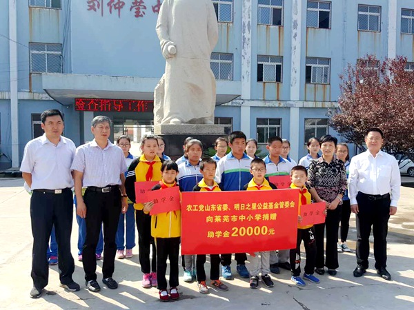2017年9月30日,由农工党山东省委会、农工党莱芜市委会、明日之星公益基金管委会组织的助学金捐助活动在莱芜市莱城区牛泉镇刘仲莹中学、雪野旅游区茶业口镇刘白杨小学举行。农工党山东省委会专职副主委王军,莱芜市政府副市长、农工党莱芜市委会主委张桂爱出席捐助活动。