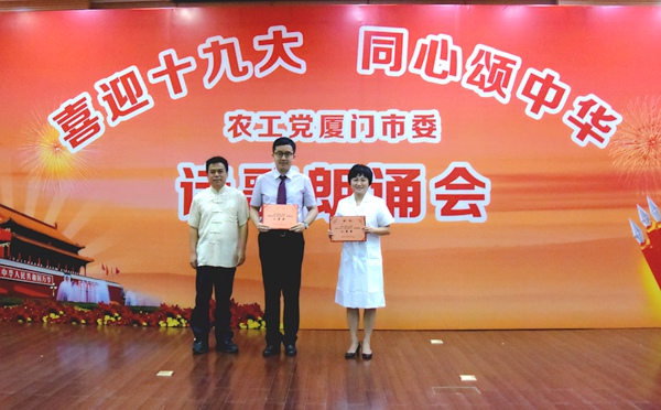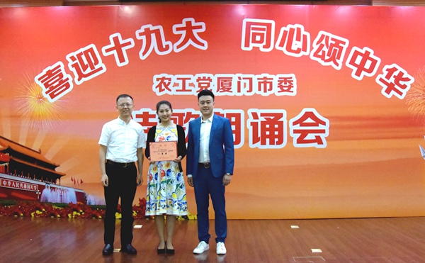 2017年10月15日下午,作为农工党厦门市委会“不忘合作初心,继续携手前进”系列主题教育活动的一项内容,农工党厦门市委会“喜迎十九大,同心颂中华”诗歌朗诵比赛在团结大厦举办。农工党厦门市委会专职副主委陈育斌参加活动并担任比赛评委,中共厦门统战部副部长曾庆军应邀参加并致辞。