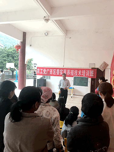 在10月17日第四个国家扶贫日,农工党广西区委会副主委何玉庭率区委会机关干部和党员企业家到区委扶贫联系点南宁市隆安县都结乡荣朋村开展扶贫日主题活动,调研了解脱贫攻坚工作情况,走访慰问贫困户,为广大养殖户送上科技培训。