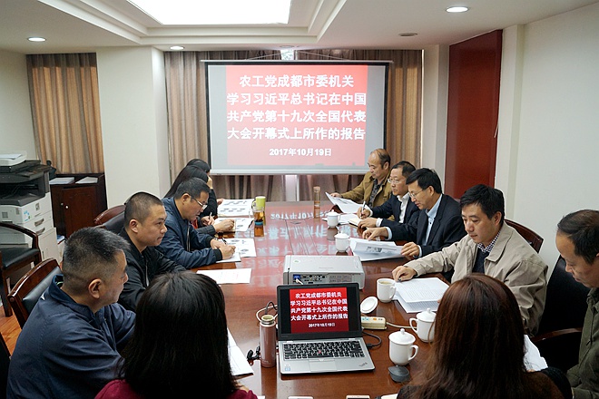 2017年10月19日,农工党成都市市委会机关召开学习传达中共十九大报告精神专题会。市委会主委甘华田出席会议并讲话,市委会副主委冯俭、魏彦玉出席会议。市委会全体机关干部参加了会议。会议由市委会副主委胡伟峰主持。
