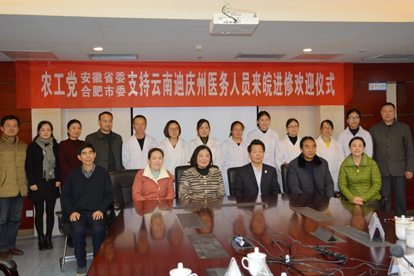 2017年12月19日上午,农工党安徽省委会、合肥市委会支持云南迪庆州医务人员来皖进修欢迎仪式在合肥市滨湖医院举行。农工党安徽省委会副主委余成林,农工党合肥市委会主委、合肥市第一人民集团医院院长戴夫,西藏山南市卫计委副主任、合肥市卫计委挂职副主任其米拉珍,合肥市第一人民集团医院副院长、滨湖医院执行院长牛伶,省委会机关副巡视员李松其等省委会、合肥市委会机关干部和滨湖医院挂职副院长索朗次仁等医院方面人员共30余人参加欢迎仪式。
