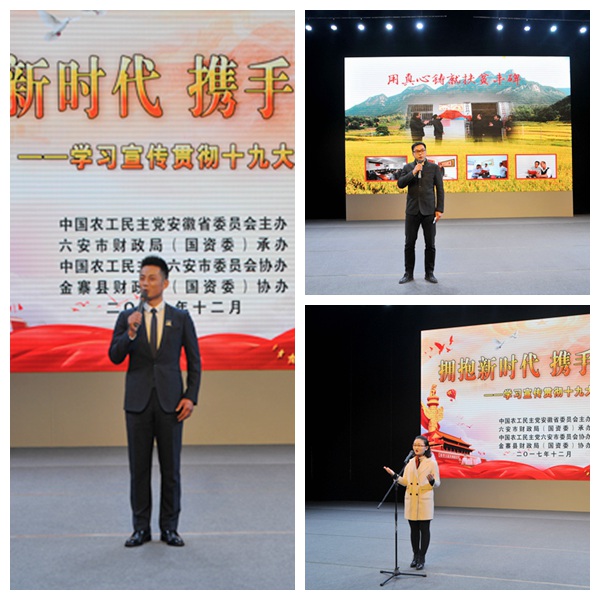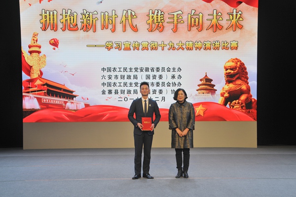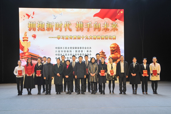 2017年12月23日,六安市广播电视台一号大厅内座无虚席,农工党安徽省委会联合六安市财政局(国资委)、农工党六安市委会和金寨县财政局共同举办的“拥抱新时代携手向未来”学习宣传贯彻中共十九大精神演讲比赛正在紧张进行。农工安徽省委会副主委余成林、孙学龙出席活动,并与六安方面的领导及各界朋友共300余人一起观看了比赛。