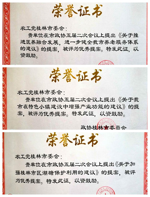 获表彰的集体提案为《关于推进医养融合发展,进一步健全我市养老服务体系的建议》、《关于我市在特色小镇建设中增强产业功能的建议》、《关于加强桂林市区湖塘保护利用的建议》;个人提案为市委会驻会副主委邓翠荣的《加强基层医疗机构诊疗能力,提升分级诊疗实效》、师大总支廖国一教授的《关于进一步挖掘桂林市龙舟民俗文化的建议》和七星总支贺金林教授等2人提出的《关于桂林旅游与地方文化资源深度融合的建议》。