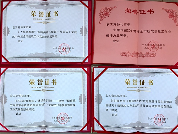2018227日上午,怀化市召开全市统战工作座谈会,对2017年度全市统战系统各单位工作进行了通报表彰。由农工党怀化市委会提交的《“杏林春雨”为脑瘫患儿撑起一片蓝天》《不忘合作初心,继续携手前进——建设“湖南地方组织革命活动史料陈列馆”》创新成果荣获“2017年度全市统战工作实践创新成果奖”,提交的《基层地方民主党派履行民主监督职能研究》理论政策研究成果荣获“2017年度全市统战理论政策研究创新成果三等奖”。农工党怀化市委会被评为“2017年度全市统战信息工作三等奖”。