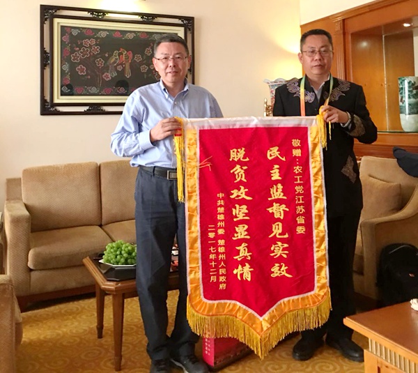 去年12月6日,农工党江苏省委会、农工党云南省委会,中共云南省楚雄州委、楚雄州人民政府在南京成功举办“楚雄州产业扶贫江苏招商推介会”,农工党江苏省各市委会专职领导及企业家200余人参加。余伯阳一行在楚雄期间,楚雄彝族自治州人大常委会副主委、农工党楚雄州委会主委夭建国受中共楚雄州委州政府主要领导委托,专门赠送锦旗以表谢意。