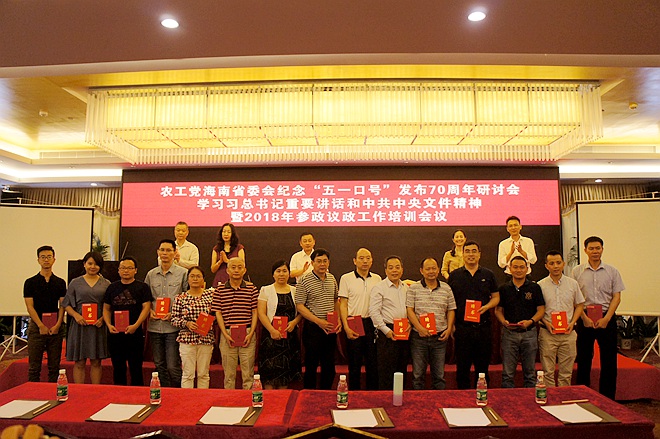 2018年4月21日,农工党海南省委会在海口召开纪念“五一口号”发布70周年研讨会,学习习近平总书记在庆祝海南建省办经济特区30周年大会上的重要讲话和中共中央文件精神暨2018年参政议政工作培训会议。农工党中央副主席、海南省副省长、省委会主委王路出席会议并讲话。中共海南省委统战部党派处副处长解德春应邀出席会议,省委会专职副主委毕华,副主委、秘书长吉小妹分别主持研讨会及培训会议。