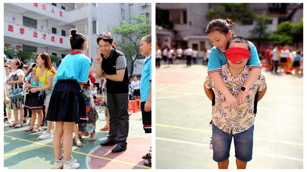 “我是你的眼”互动环节,爸爸们的眼睛全部用红领巾蒙住,背着孩子由孩子指路投球。虽然爸爸们汗流浃背,但个个脸上洋溢着灿烂的笑容,此时最好的表达莫过于“爸爸,你把我养大,我陪你到老”、“你老了我就是你的眼”、“爸爸,我爱你”......