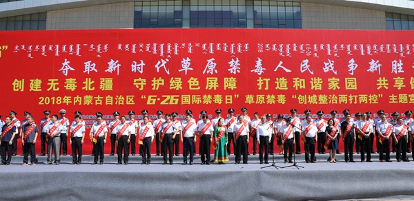 2018年6月26日是第31个国际禁毒日。当天上午,以“创建无毒北疆,守护绿色屏障,打造和谐家园,共享健康人生”为主题的内蒙古自治区“6•26国际禁毒日”草原禁毒“创城整治两打两控”主题宣传活动在内蒙古国际会展中心广场举行。