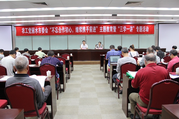 2018年9月28日,农工党丽水市委会举办“不忘合作初心,继续携手前进”主题教育暨“三学一讲”专题活动。农工党丽水市委会主委丁岳清带头讲党课,市委会专职副主委卢汝兰主持活动。