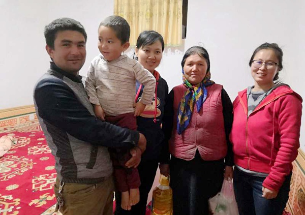 一进家门,机关干部就与亲戚们热情的拥抱在一起,大家都为各自的亲戚准备了米面油等生活用品,一句句暖声的问候,一个个真诚的微笑,让这个冬天不再寒冷。顾不上路途劳顿,当天下午,大家就与亲戚们融入在一起,与亲戚零距离相处,帮助亲戚打扫院落,喂羊喂牛,同亲戚一起学习习近平新时代中国特色社会主义思想、十九大精神,与亲戚的孩子们一起玩耍,教孩子们学国语,一起准备晚餐,详细询问亲戚的家庭情况、生活情况,以话家常形式拉近了与亲戚们的距离。