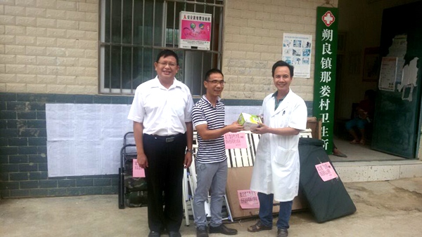 近日,农工党百色市委会委员、农工党百色市综合医卫支部主委、百色田东好得快大药房叶继武总经理来到田东县朔良镇那娄村,向那娄村卫生所捐赠价值五千元的多功能高级诊疗床、诊疗桌椅、血压器等医疗设备,为缺医少药的偏远山区农民群众改善就医环境。