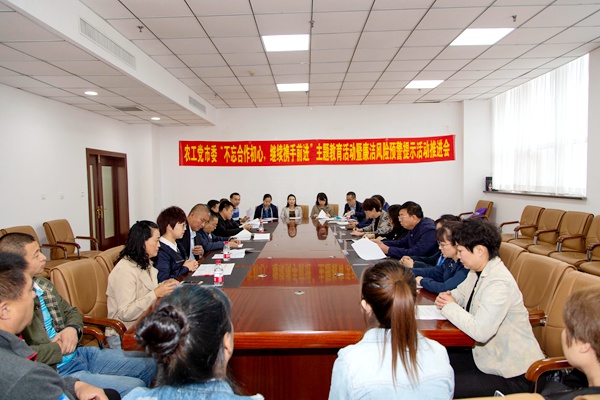 2019年9月20日上午,农工党齐齐哈尔市委会在党政机关办公中心3号楼3125会议室召开了“不忘合作初心,继续携手前进”主题教育活动暨廉洁风险预警提示活动推进会。市委会主委戴晓霞、市委会副主委李继伟出席会议,市委会驻会副主委兼秘书长陈曦主持会议。