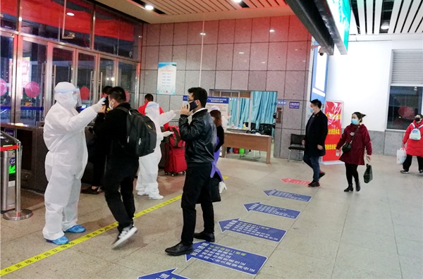 孔毅(左一)穿着防护服在北海市火车站对进入北海市的旅客进行体温检测