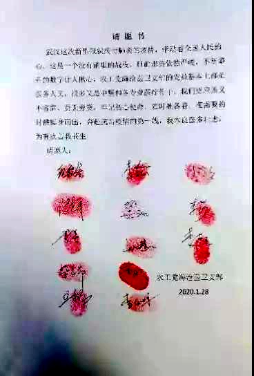 厦门市海沧区医卫支部纪程宏等13名党员主动写了一份请愿书,表示时刻准备愿意挺身而出奔赴疫情一线的决心