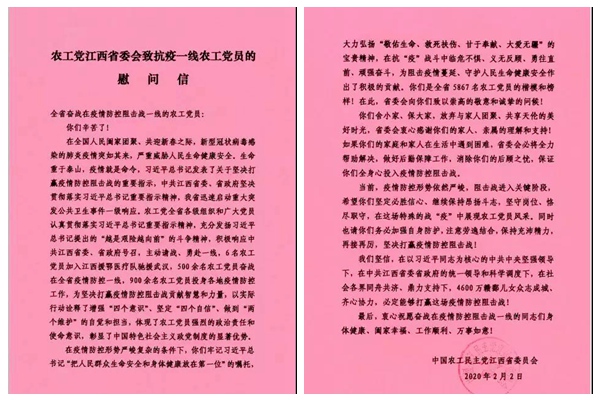 在全国人民阖家团聚、共迎新春之际,新型冠状病毒感染的肺炎疫情突如其来,严重威胁人民生命健康安全。生命重于泰山,疫情就是命令,习近平总书记发表了关于坚决打赢疫情防控阻击战的重要指示,中共江西省委、省政府坚决贯彻落实习近平总书记重要指示精神,我省迅速启动重大突发公共卫生事件一级响应。农工党全省各级组织和广大党员认真贯彻落实习近平总书记重要指示精神,充分发扬习近平总书记提出的“越是艰险越向前”的斗争精神,积极响应中共江西省委、省政府号召,主动请战、勇赴一线,6名农工党党员加入江西援鄂医疗队驰援武汉,500余名农工党党员奋战在全省疫情防控一线,900余名农工党党员投身各地疫情防控工作,为坚决打赢疫情防控阻击战贡献智慧和力量,以实际行动诠释了增强“四个意识”、坚定“四个自信”、做到“两个维护”的自觉和担当,体现了农工党员强烈的政治责任和使命意识,彰显了中国特色社会主义政党制度的显著优势。