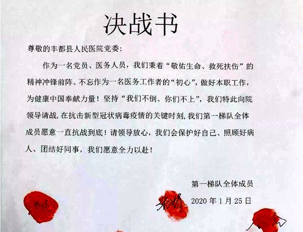 疫情就命令,抗疫舍我其谁。作为一名医务人员、一名农工党党员,秉承着“救死扶伤,敬佑生命”的使命,张娟第一时间、第一批就向医院递交了抗疫决战申请书,决心为疫情抗战到底。