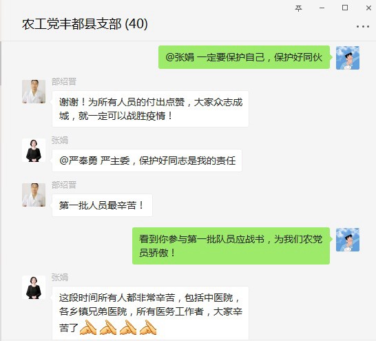 农工党丰都支部党员得知张娟作为第一批主动请缨参加抗疫的医务成员后,纷纷为张娟点赞,因隔离病房无法现场看望,只能通过微信提醒她注意自我防护,张娟回复大家,她一定会保护好团队成员,并不忘为其他抗疫单位付出的努力道一声辛苦。这,就是一名农工党党员的胸怀与担当!