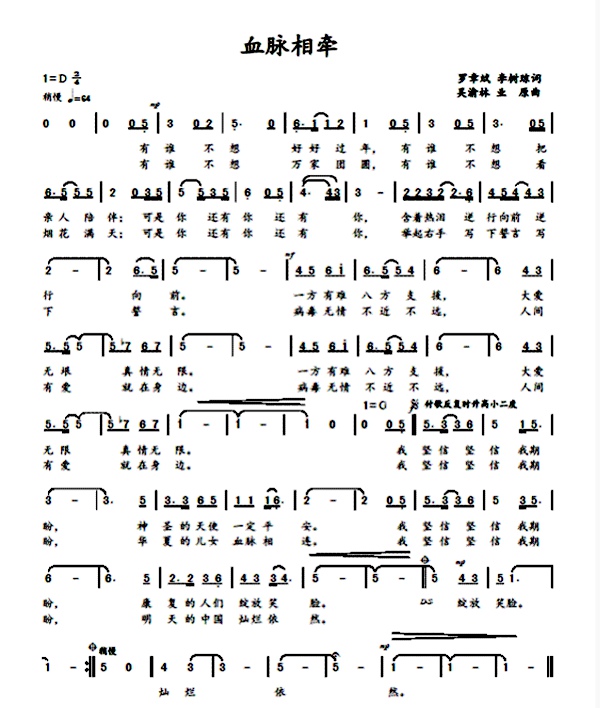 歌曲《血脉相牵》表现抗击疫情勇士不顾个人安危逆行前线感人情怀,歌颂中华民族血脉相连相亲相助美好品德。由农工党党员、云南青年歌唱家高淑琴和云南青年歌唱家李昂倾情演唱。
