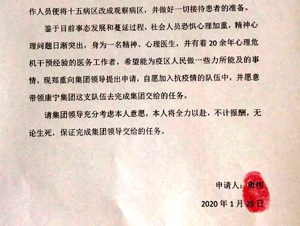武汉疫情发生正值春节假期。唐伟教授和温州康宁医院集团的数十位医务人员在得知了疫情后,第一时间就写了请愿书,主动请缨支援武汉。温州医科大学心理危机干预大队一百多名队员也在队长唐伟教授的集结下,整装待命。