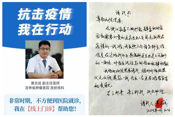 自疫情防控阻击战打响以来,农工党吉林省肿瘤医院支部深刻认识防控疫情斗争的严峻性和紧迫性,为了更好的保证我院肿瘤病人在住院治疗期间安全有序的进行诊疗活动,避免出现交叉感染,做好疫情防控工作,农工党吉林省肿瘤医院支部副主委、放射线科黄志成副主任立下请战书,首当其冲,自愿冲锋在前,奔赴了特需发热会诊一线,严阵以待,不讲代价,不休假日。同时他提供电话免费多学科诊疗服务,以及微信在线,好大夫在线等义诊平台免费影像阅片、解读检查报告等医疗服务,为患者答疑解惑,全力满足广大肿瘤患者疫情期间的诊疗需求,为患者生命健康筑起了一道安全屏障。