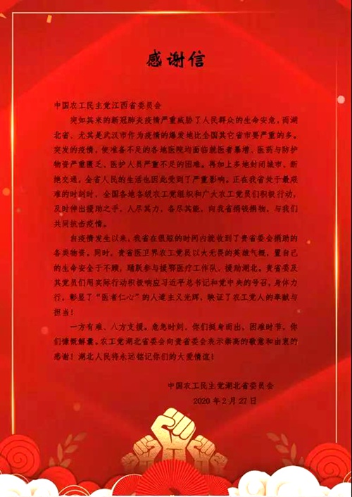 近日,农工党湖北省委会给农工党江西省委会发来感谢信,对江西省农工党员在新冠肺炎疫情发生时,迅速响应习近平总书记和中共中央的号召,积极行动,捐款捐物,特别是医卫界农工党党员,置自己的生命安全于不顾,踊跃参与援鄂医疗工作队,援助湖北,表示崇高的敬意和由衷的感谢。